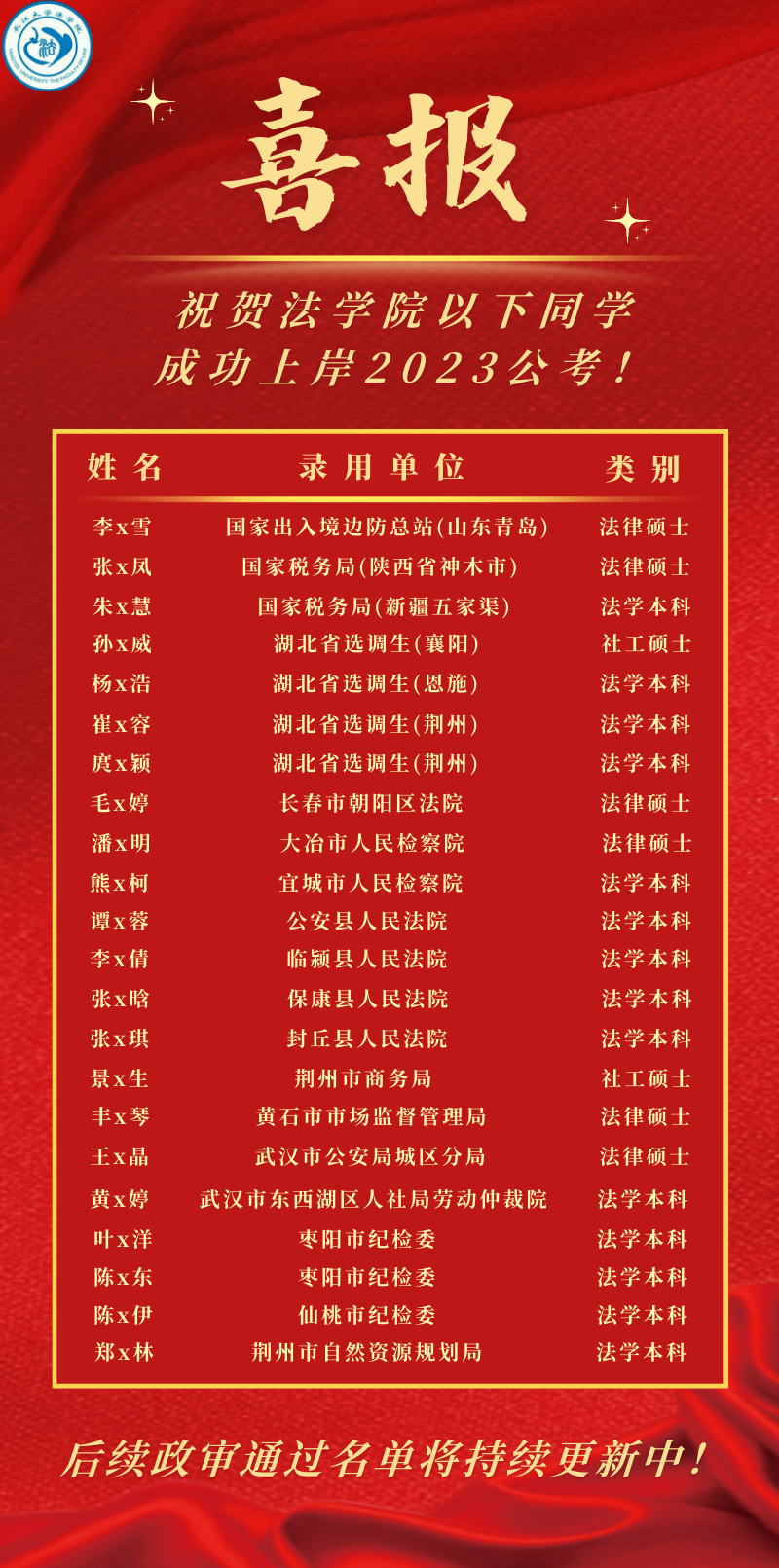 随着各地公职招录的面试、体检、政审等程序的完成,2023年度毕业生公职录用再传捷报,截至7月20日,共有22名毕业生被顺利录用各类公务人员,其中,通过中央机关及其直属机构人数3名。在湖北省选调生考试中,3044永利集团成功考取4名,占全校总通过人数的14.29%。
